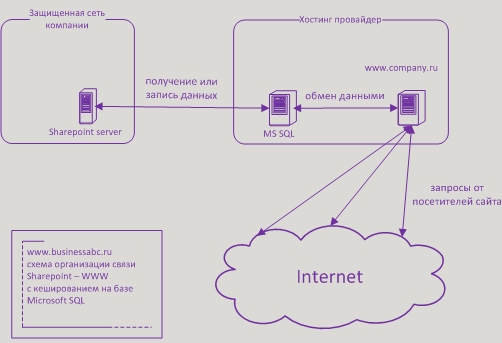 Такая организация связи между внешним сайтом компании и внутренним информационным сервером на базе MS Sharepoint, позволяет решить